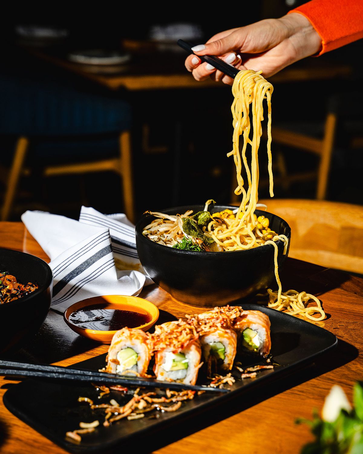 El desorden es parte del lenguaje visual del proyecto. Mesas usadas, platos compartidos y gestos espontáneos se integran en composiciones que priorizan la energía, el ritmo y la autenticidad del lugar. Cada imagen responde al contexto y a la dinámica real del servicio, sin poses forzadas ni intervenciones innecesarias.